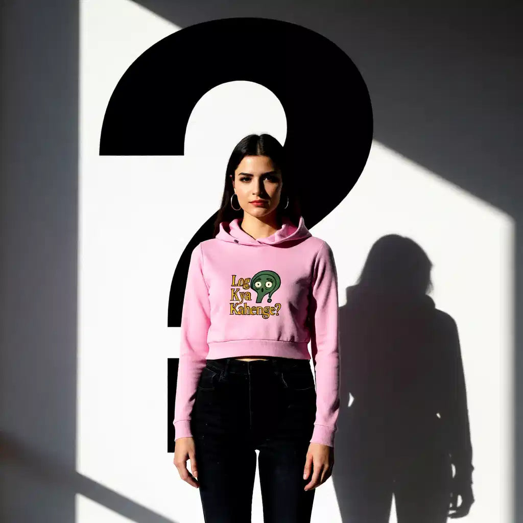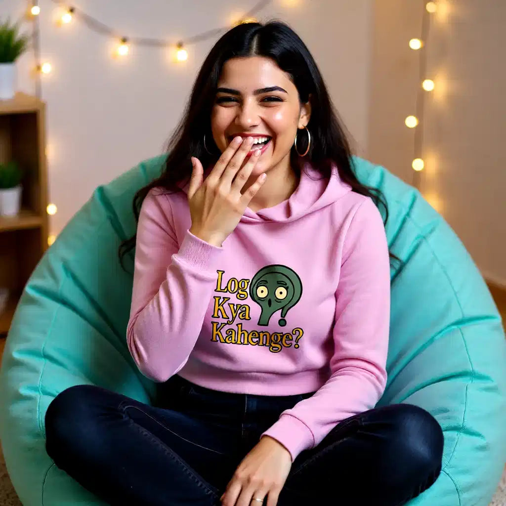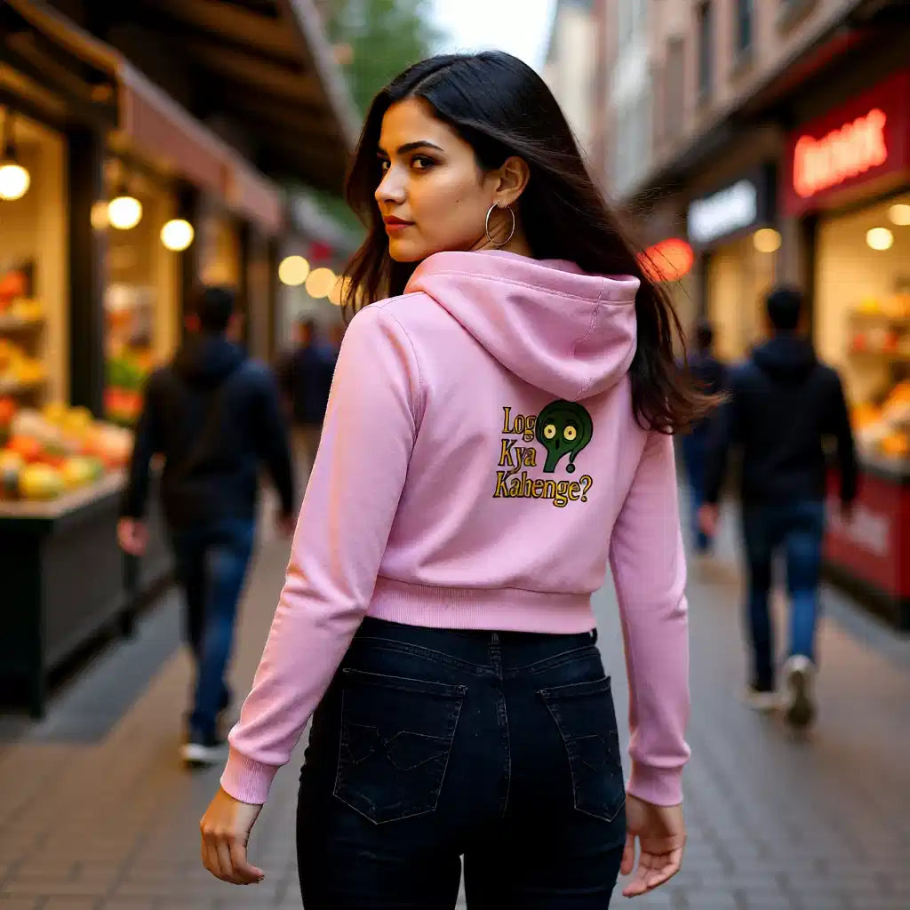 This cropped hoodie boldly features the "Log Kya Kahenge" design printed on both front and back, perfect for women who defy opinions. Made from thick, soft cotton with ribbed hems, it offers warmth and a stylish edge for confident everyday wear.